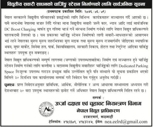 सरकारले देशभरका ५० ठाउँमा विद्युतीय सवारी साधनको चार्जिङ स्टेशन निर्माण गर्ने योजना अघि सारेको छ । नेपाल विद्युत प्राधिकरणले एउटा ठाउँमा तीन वटासम्म गाडी अट्ने गरी चार्जिङ स्टेशन बनाउने योजना अघि सारेको हो । त्यसको लागि मुख्य शहरभित्रका मूल सडक तथा मुख्य राजमार्गसँग जोडिएका जग्गा निशुल्क उपलब्ध गराउन पनि प्राधिकरणले आह्वान गरेको छ । राजमार्गसँग जोडिएका व्यापारिक भवन, सुपर मार्केट, सिनेमा हल, पार्क, विश्वविद्यालय, सरकारी निकाय, होटल तथा रेष्टुरेन्ट आदिका पार्किङस्थल भएका ठाउँ चार्जिङ स्टेशन बनाउन उपयुक्त हुने प्राधिकरणले जनाएको छ ।