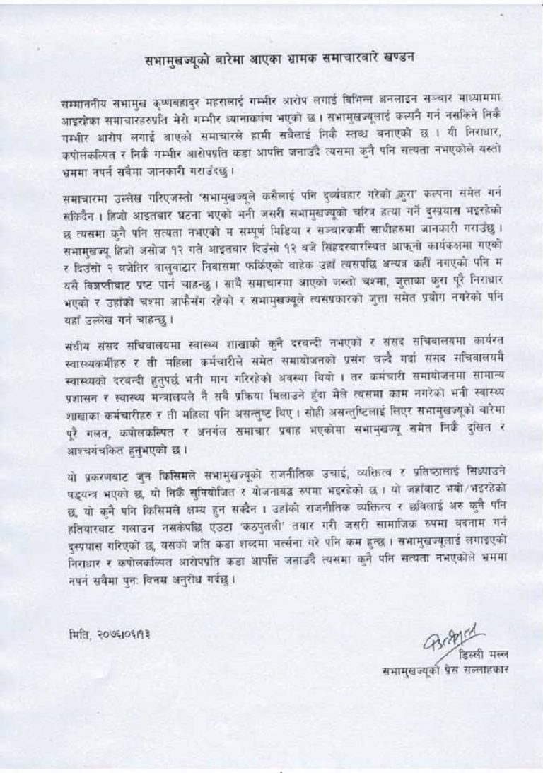सभामुख महराका प्रेस सल्लाहकार डिल्ली मल्लले सोमबार राति विज्ञप्ति जारी गरी महिलाले लगाएको आरोपको खण्डन गरेका हुन् ।