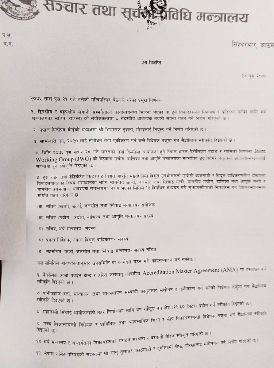 सरकारले पुस २१ गते बसेको मन्त्रिपरिषद् बैठकको निर्णय सार्वजनिक गरेको छ ।