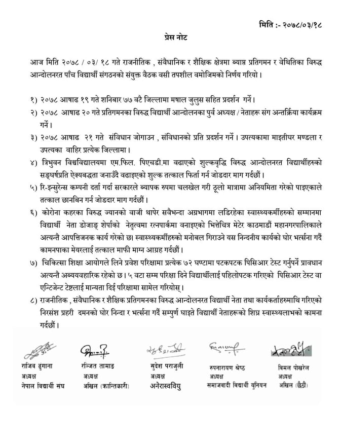 विपक्षी गठबन्धनमा आवद्ध दलहरु निकट विद्यार्थी संगठनहरुले विहीबार काठमाडौंमा सरकारविरुद्ध प्रदर्शन गर्ने भएका छन् । नेविसंघ, अखिल क्रान्तिकारी, अनेरास्ववियु, समाजवादी विद्यार्थी युनियन र अखिल छैटौंले बिहीबार दिउँसो ३ बजे काठमाडौंको भृकुटीमण्डपमा भेला भएर संयुक्त विरोध प्रदर्शन गर्न लागेको नेबिसंघ महामन्त्री बलदेव तिमल्सिनाले जानकारी दिए ।