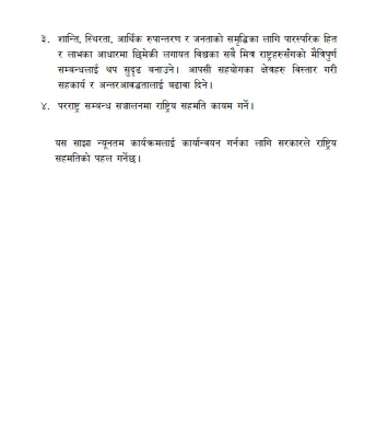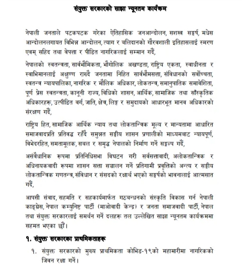 सरकार सञ्चालन गर्न सत्तारुढ गठबन्धनको कार्यदलले तयार गरेको न्यूनतम साझा कार्यक्रम र कार्यविधि प्रतिवेदन सार्वजनिक भएको छ । प्रधानमन्त्री निवास बालुवाटारमा आइतबार प्रधानमन्त्री शेरबहादुर देउवालगायत मन्त्री, सत्तारुढ दलका शीर्ष नेता र कार्यदलका संयोजक सहभागी भएको बैठकले प्रतिवेदन सार्वजनिक भएको हाे ।