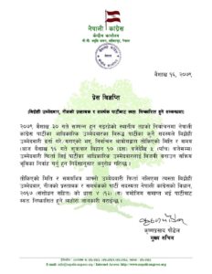 नेपाली कांग्रेसले विद्रोही बागी उम्मेदवारी फिर्ता लिन फेरि आग्रह गरेको छ । पार्टी मुख्य सचिव कृष्णप्रसाद पौडेलले प्रेस विज्ञप्ति जारी गर्दै आज १० बजेदेखि बेलुकी ५ बजेसम्ममा उम्मेदवारी फिर्ता लिन आग्रह गरे ।