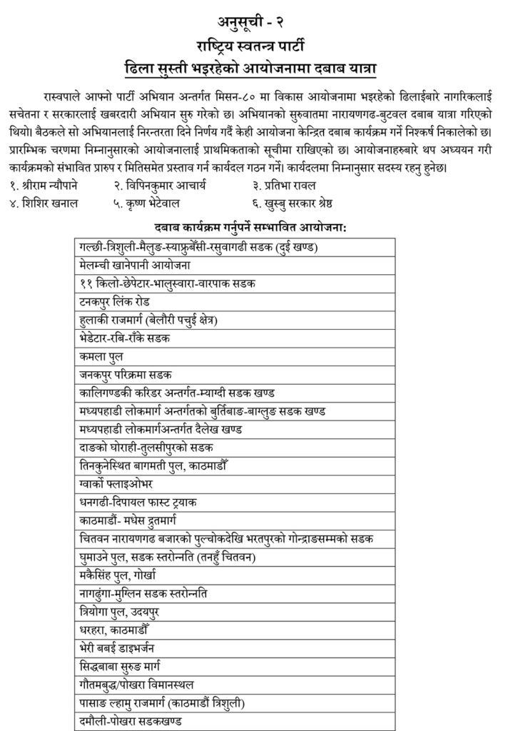 दबाब कार्यक्रम गर्ने आयोजनाको प्रारम्भिक सूचीमा गल्छी–त्रिशूली–मैलुङ–स्याफ्रुबेसी–रसुवागढी सडकलाई पहिलो नम्बरमा राखिएको छ । यस्तै, रहरा र मेलम्ची खानेपानी आयोजना लगायत रहेका छन् ।
